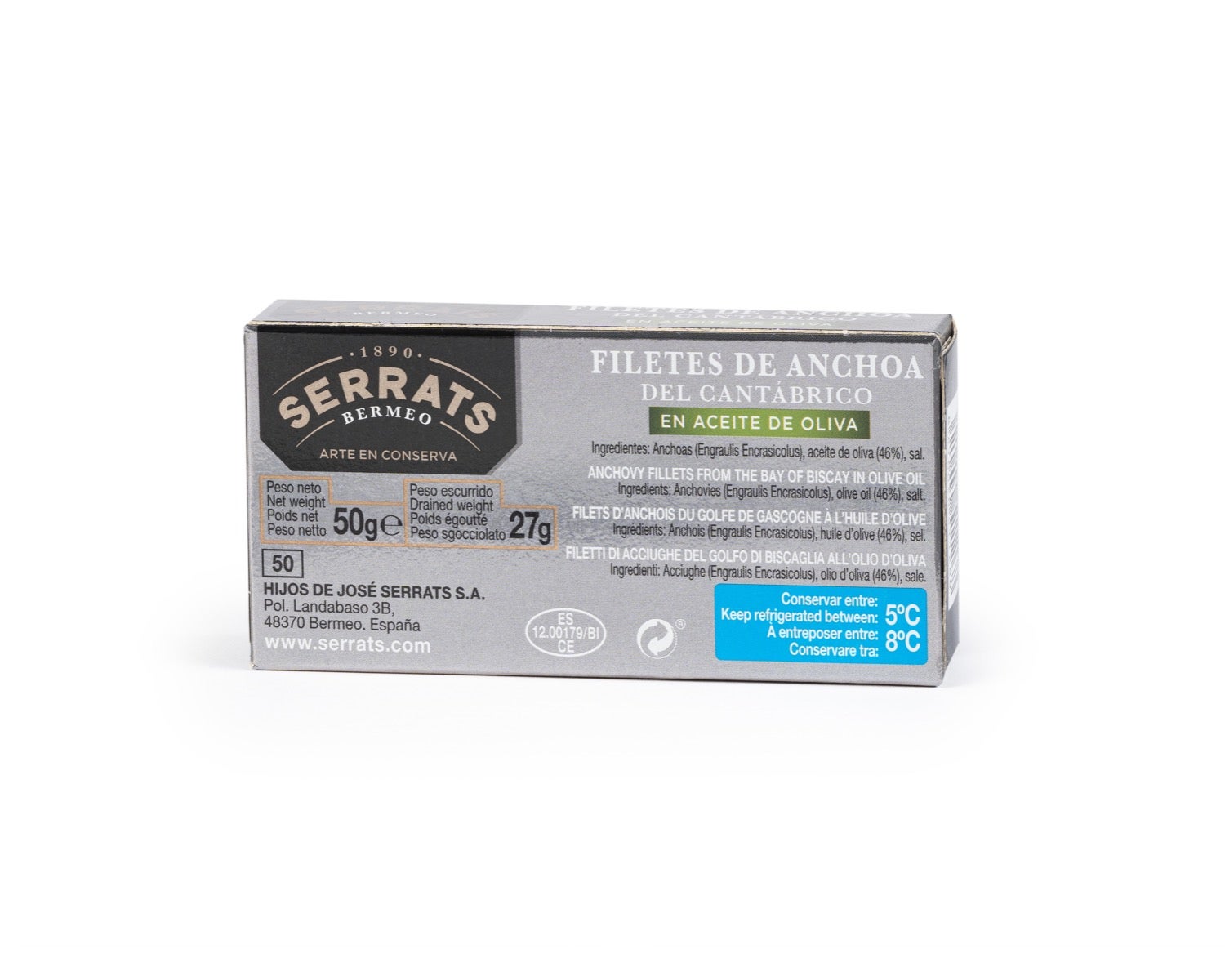 En Conservas Serrats, para elaborar las anchoas en aceite de oliva sólo utilizamos anchoa de la más alta calidad, la "Engraulis Encrasicholus" pescada en el mar Cantábrico, en aguas del Golfo de Vizcaya, y en primavera que es su momento óptimo, entre los meses de Abril y Junio.