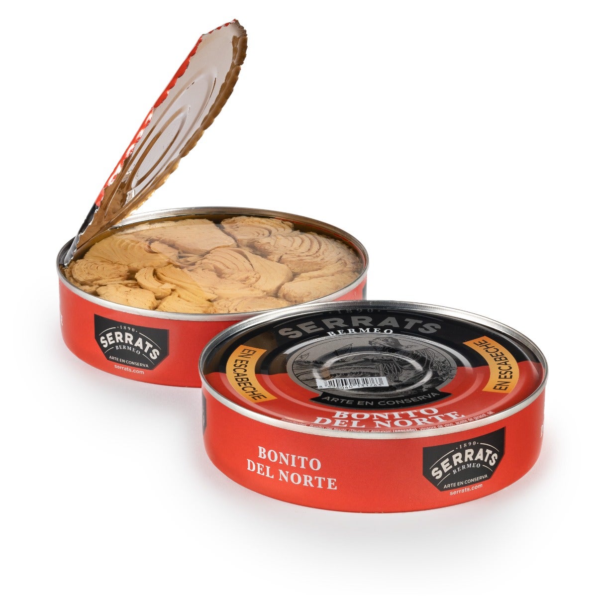 Lomos de Bonito del Norte de la costera del Cantábrico. En Conservas Serrats los seleccionamos cuidadosamente. Cubiertos de escabeche, te los presentamos en envase metálico.