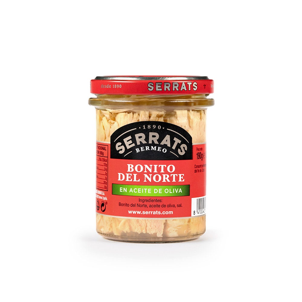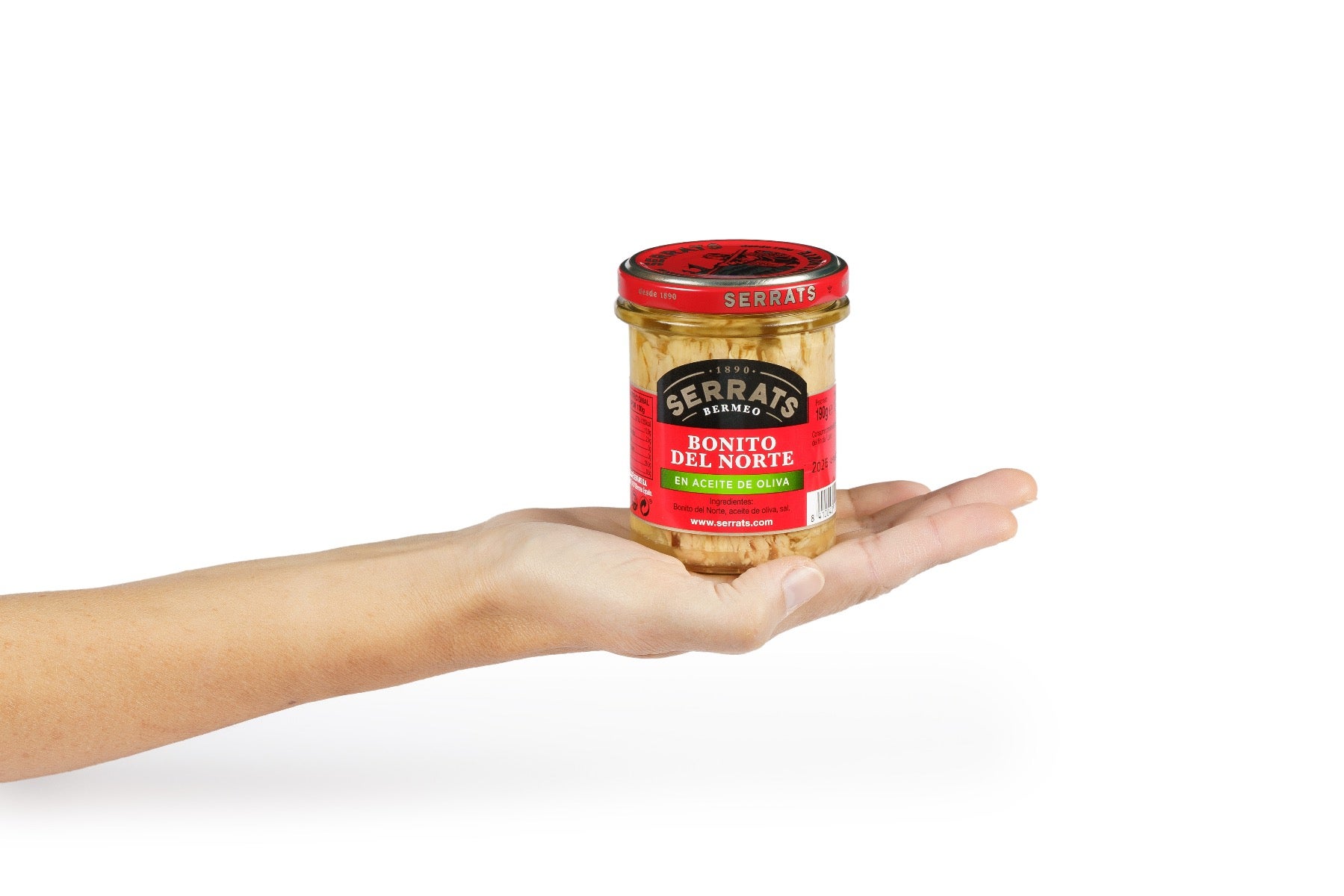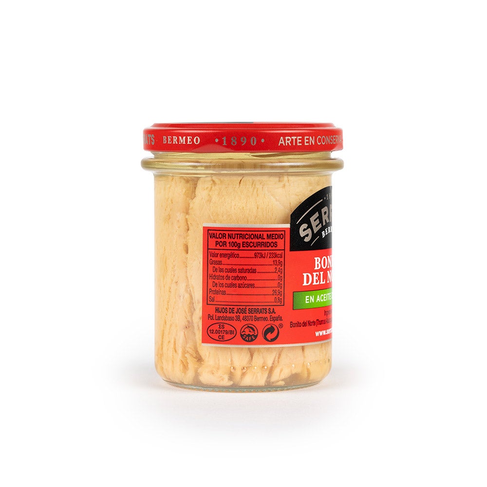Lomos de Bonito del Norte de la costera del Cantábrico. En Conservas Serrats los seleccionamos cuidadosamente. Cubiertos aceite de oliva, te los presentamos en frasco de cristal .