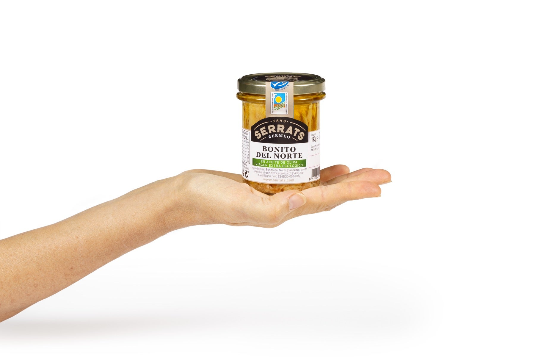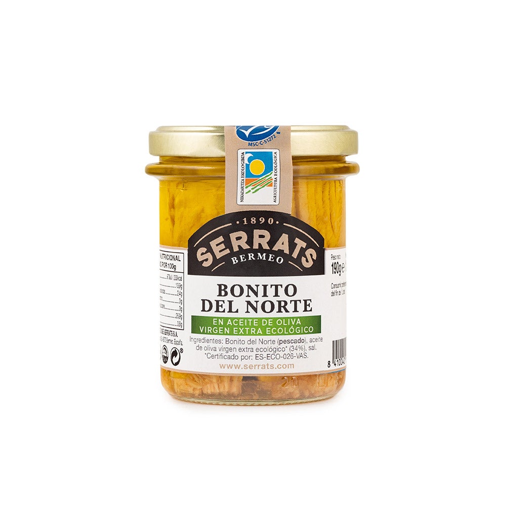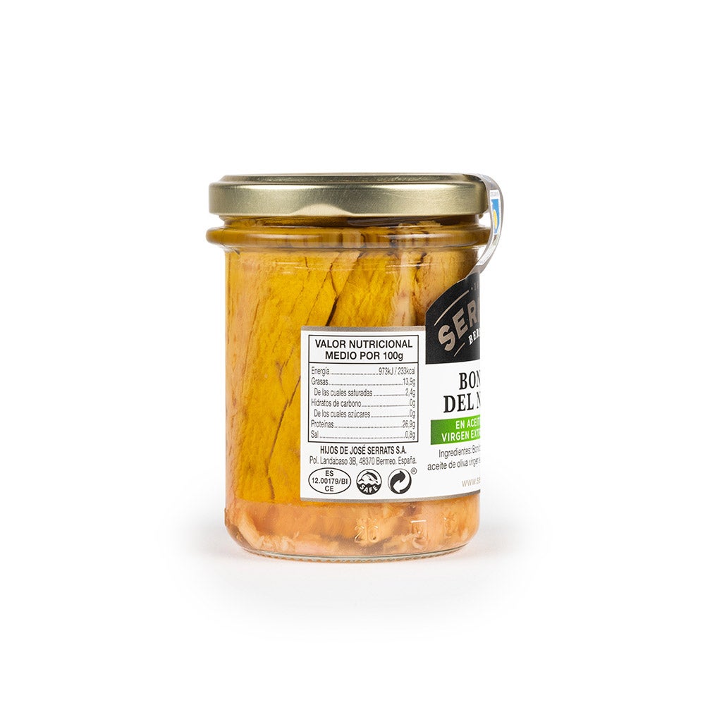 Lomos de Bonito del Norte de la costera del Cantábrico. En Conservas Serrats los seleccionamos cuidadosamente. Cubiertos de aceite de oliva virgen extra ecológico, te los presentamos en frasco de cristal .