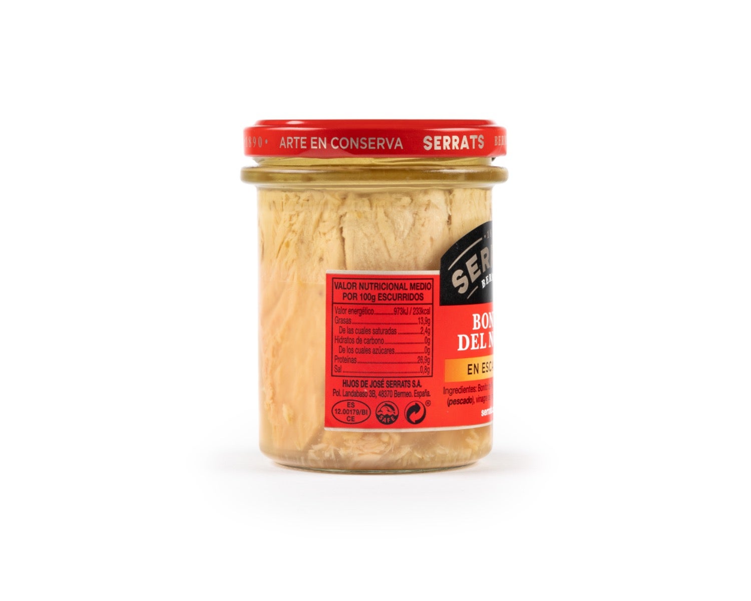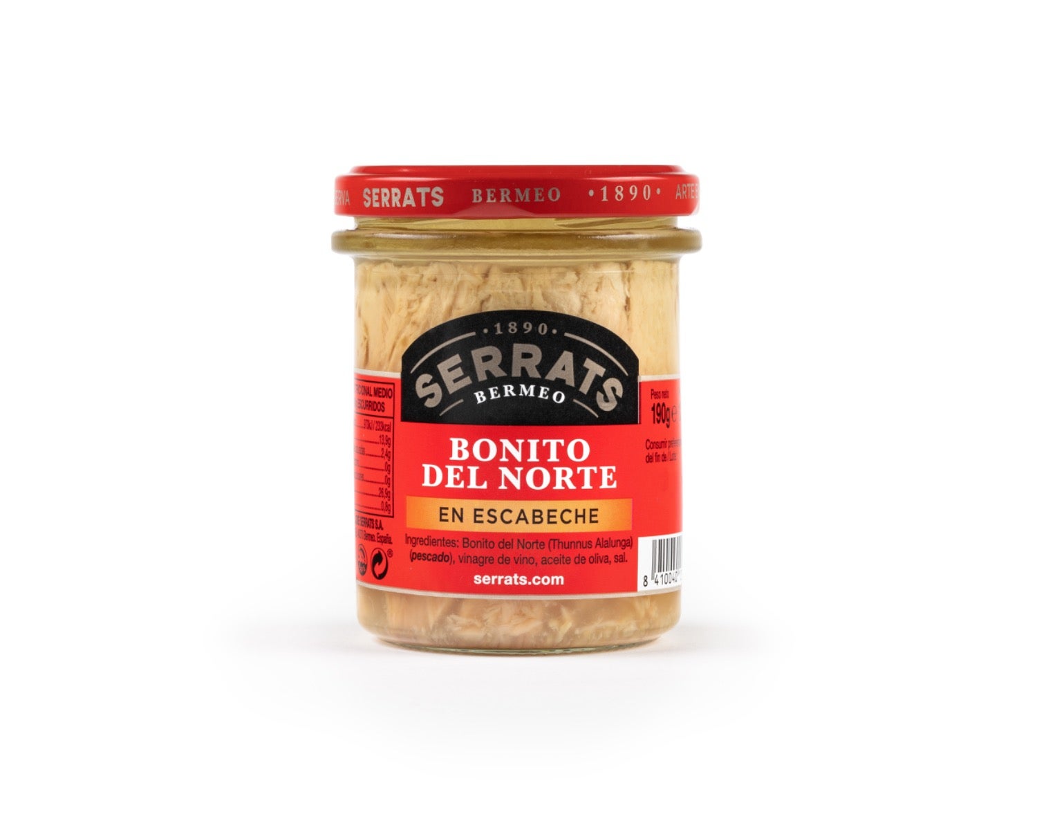 Lomos de Bonito del Norte de la costera del Cantábrico. En Conservas Serrats los seleccionamos cuidadosamente. Cubiertos de escabeche, te los presentamos en frasco de cristal .