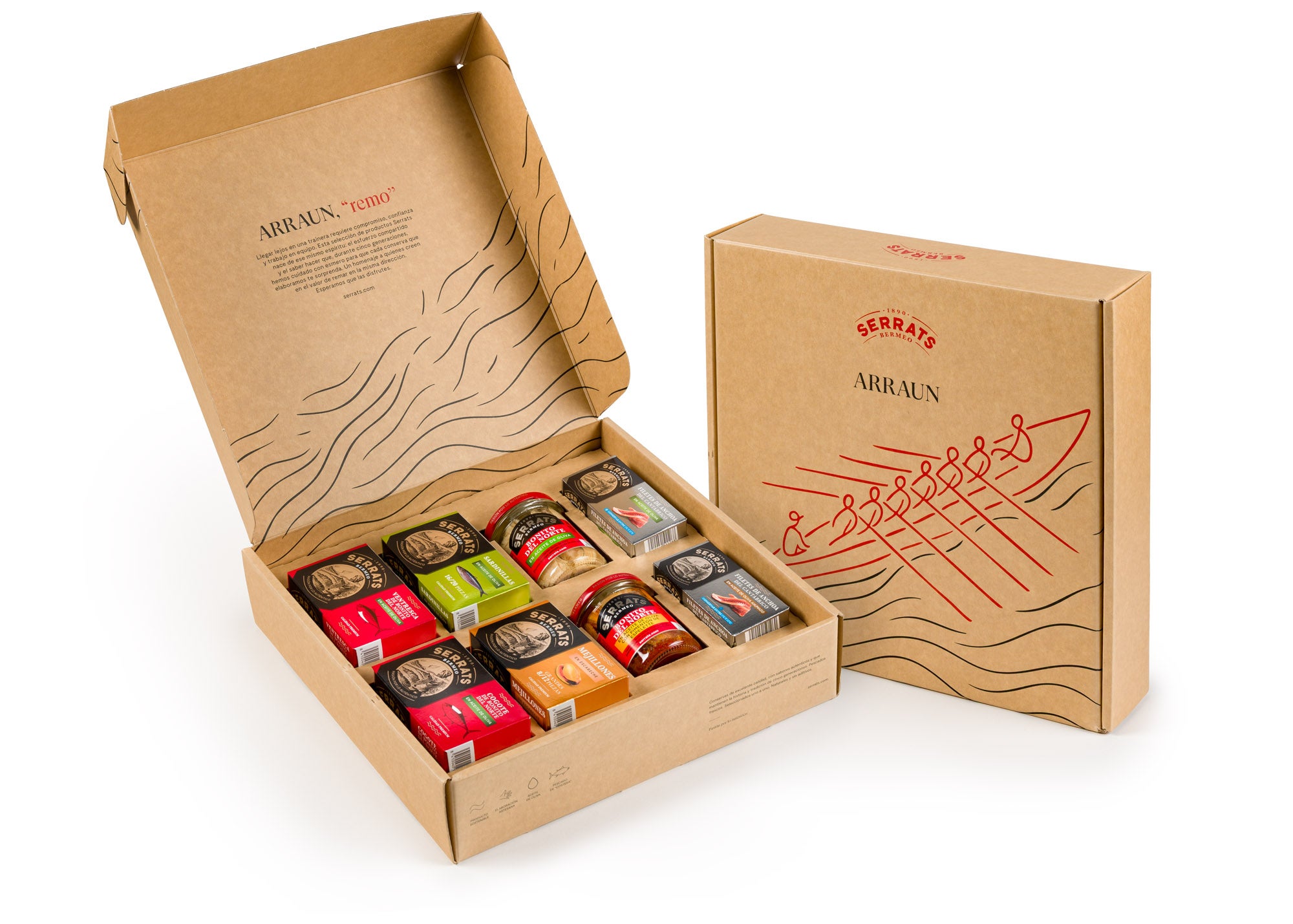 La Caja Regalo ARRAUN está compuesta por una selección de las mejores conservas del Cantábrico: Lomos de Bonito del Norte en oliva y en oliva con pimentón de Espelette; Cogote y Ventresca de Bonito del Norteen aceite de oliva, filetes de Anchoas del Cantábrico en dos versiones, con oliva y con aceite de oliva ahumado a la leña. Y por último dos de nuestras especialidades, los Mejillones en escabeche y las Sardinillas “txikis” en aceite de oliva.