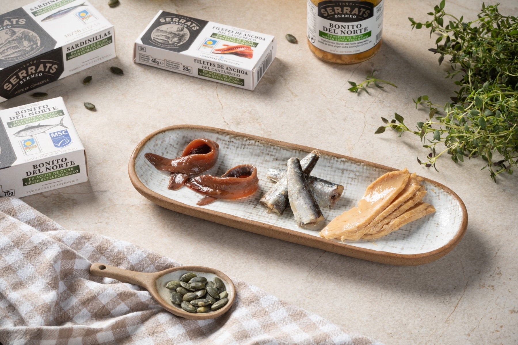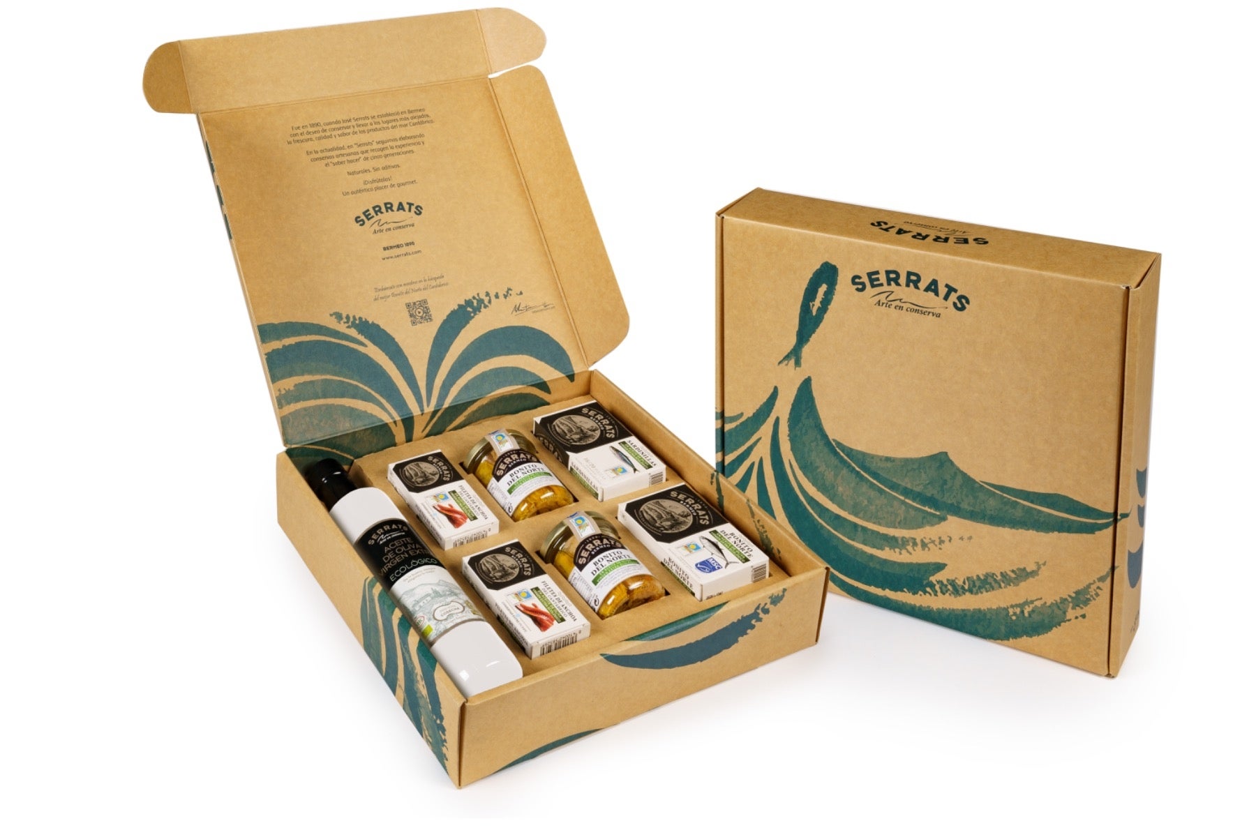 Esta caja "MUNDO ECO" recoge una selección de conservas de Bonito del Norte y Anchoas que han sido elaboradas con pescado de la costera del Cantábrico, capturado mediante artes de pesca tradicionales, las más sostenibles, ya que respetan el entorno marino y evitan capturas accidentales de otras especies.