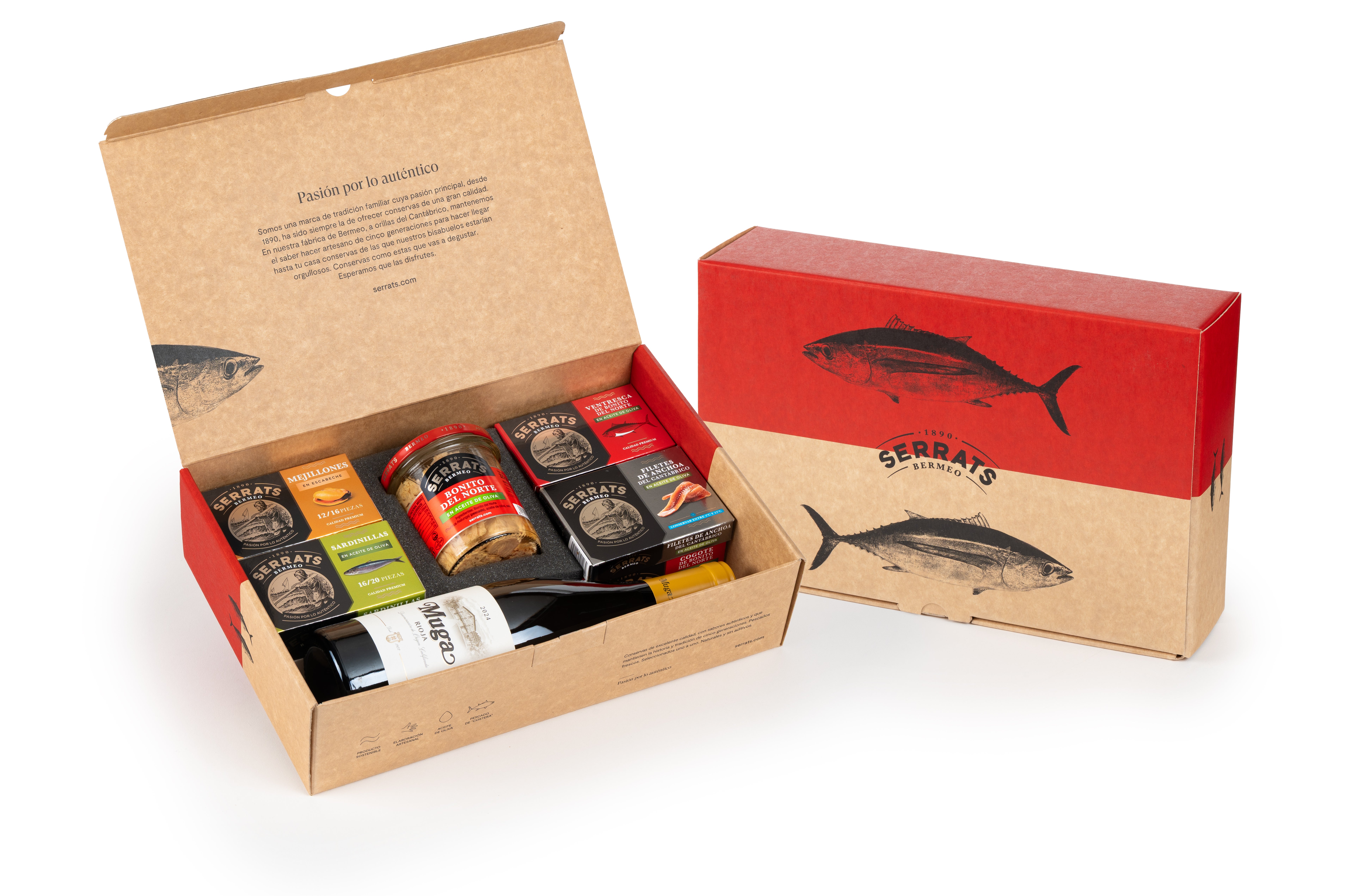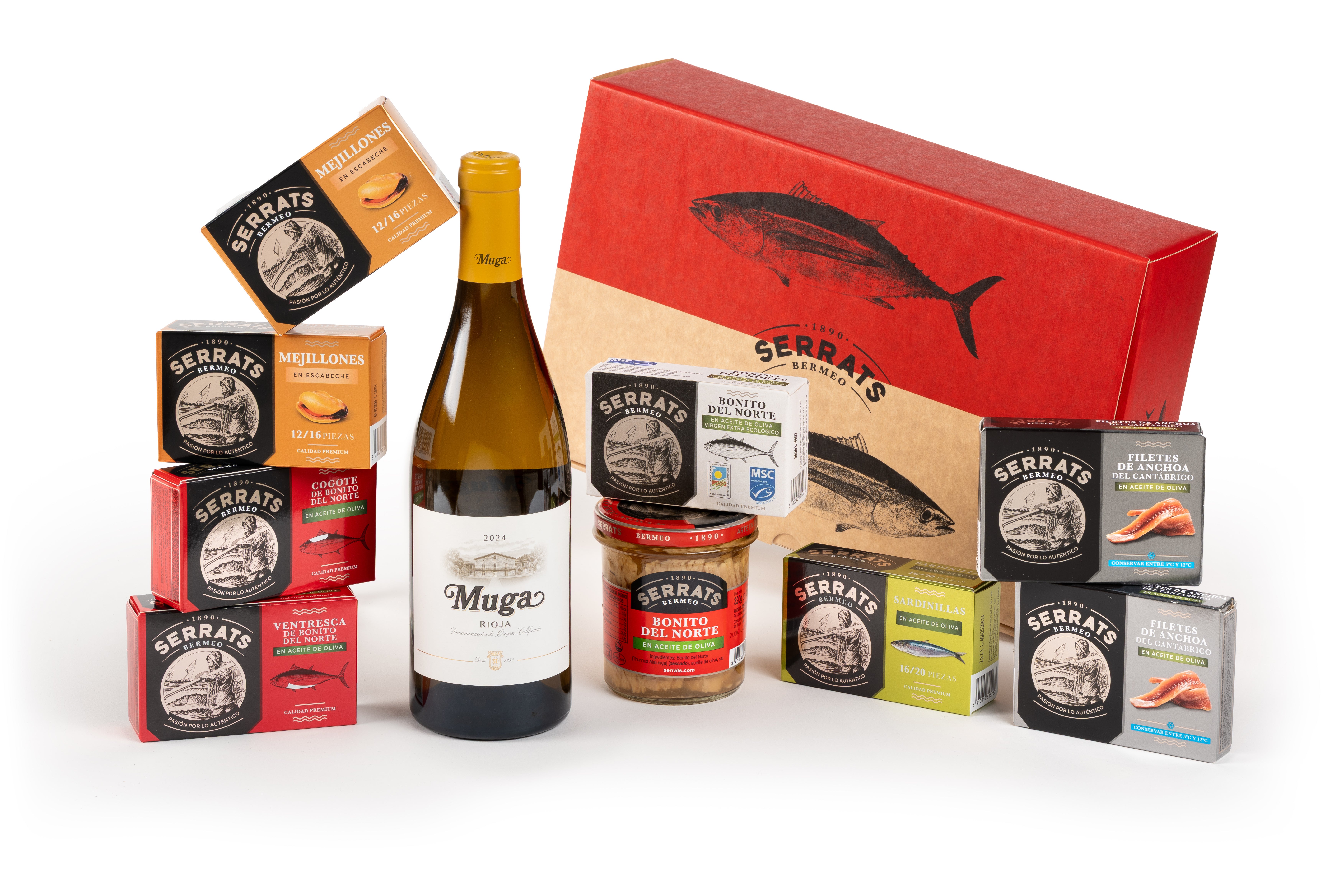 La caja reúne bonito del norte en aceite de oliva, bonito del norte en aceite de oliva virgen extra ecológico, sardinillas en aceite de oliva, mejillones en escabeche, anchoas, ventresca y cogote de bonito, acompañados de un Vino Blanco MUGA, que completa este conjunto gastronómico equilibrado y lleno de matices.