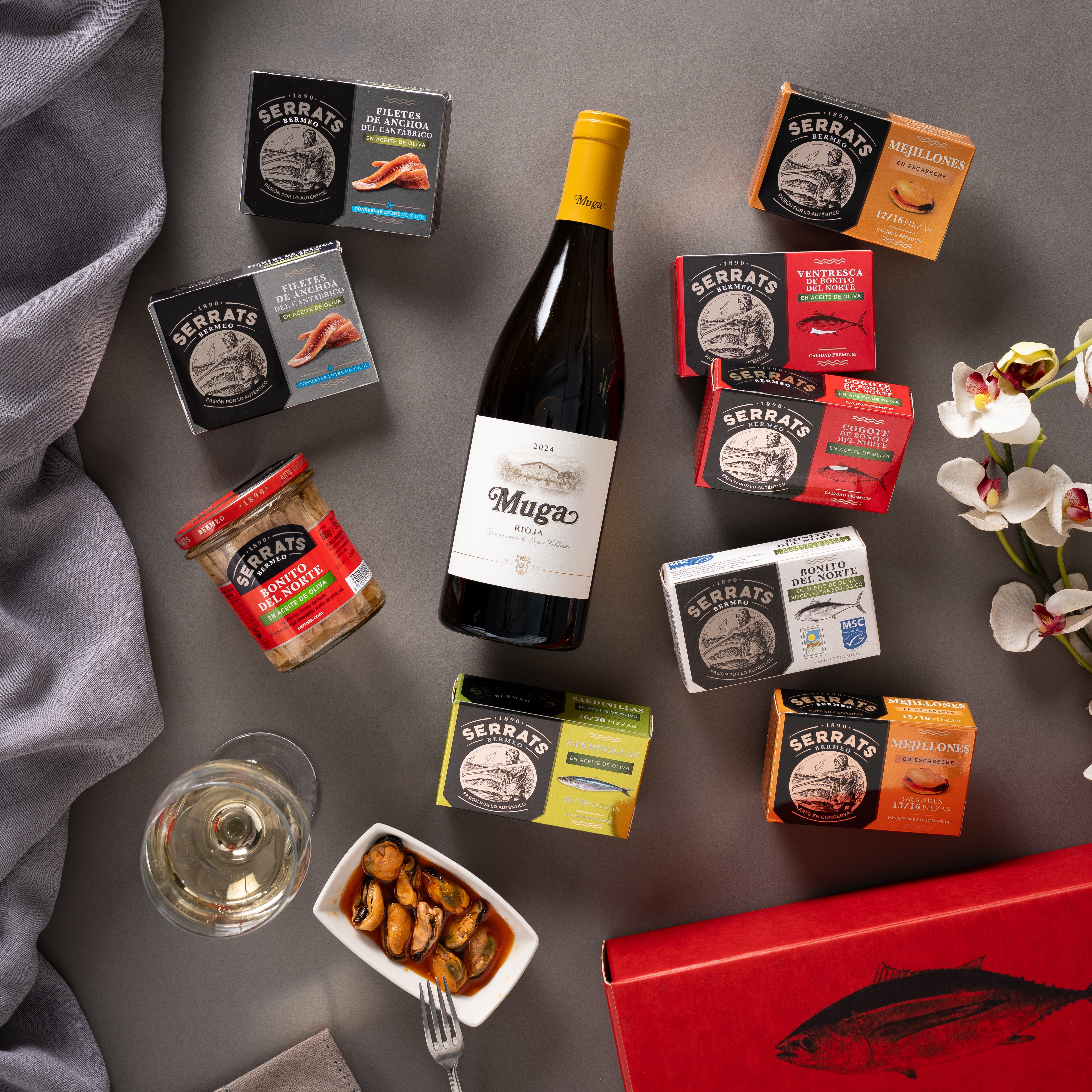 Durante solo 5 días, te ofrecemos una edición especial que combina una cuidada selección de nuestras mejores conservas del Cantábrico con un Vino Blanco MUGA, fresco, equilibrado y elegante. Un maridaje pensado para disfrutar, compartir y celebrar la vida con mucho mimo.