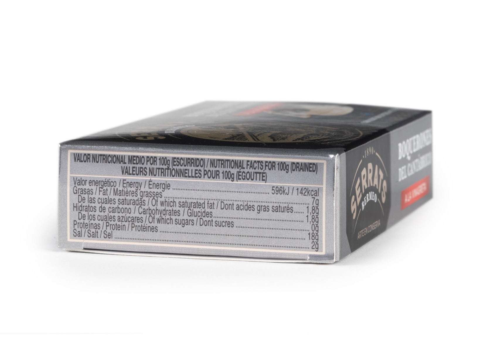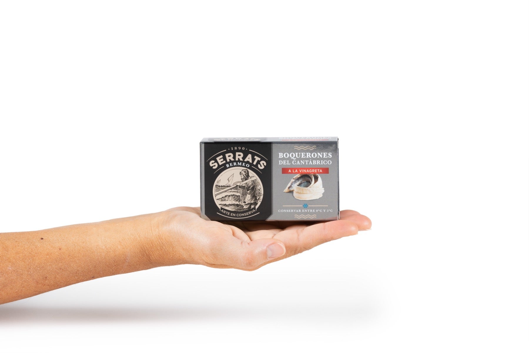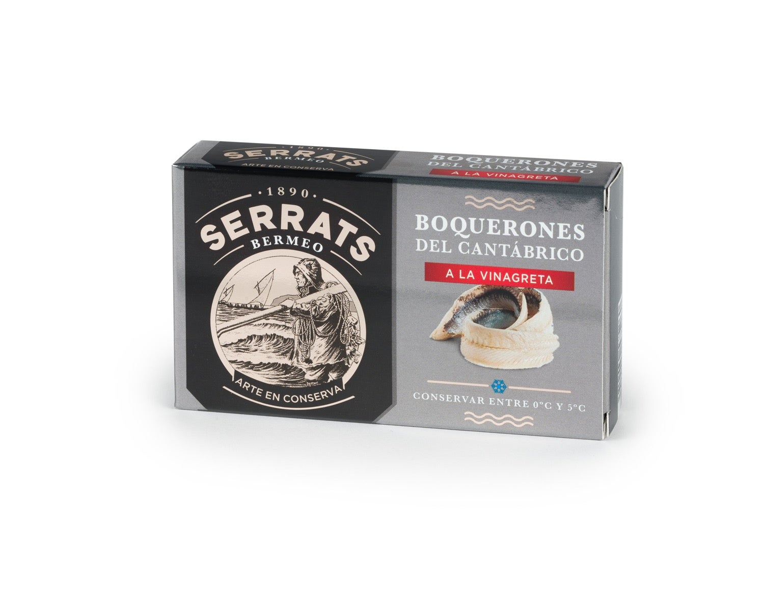 Boquerones del Cantábrico y de primavera. En Conservas Serrats los seleccionamos cuidadosamente. Cubiertos con nuestra vinagreta artesanal, te los presentamos en envase metálico.