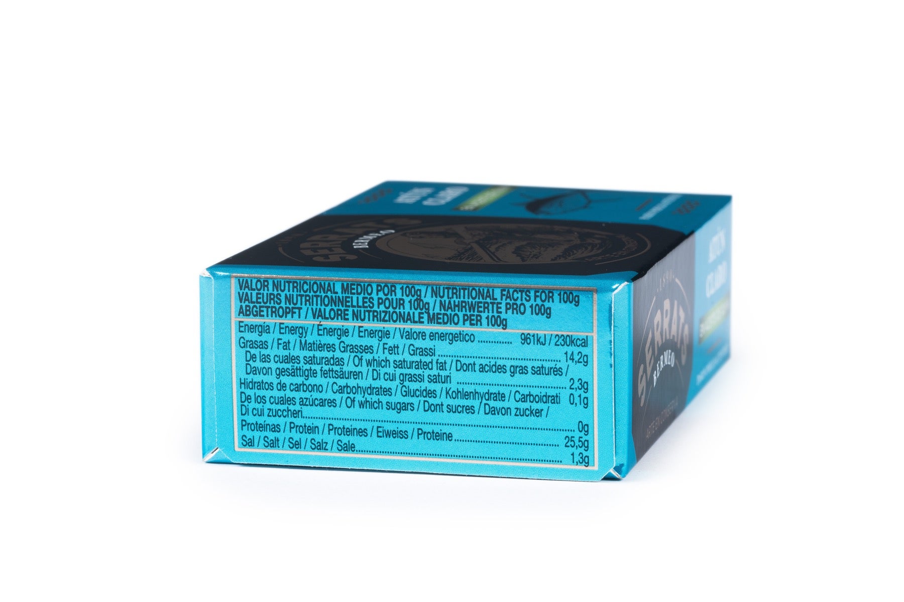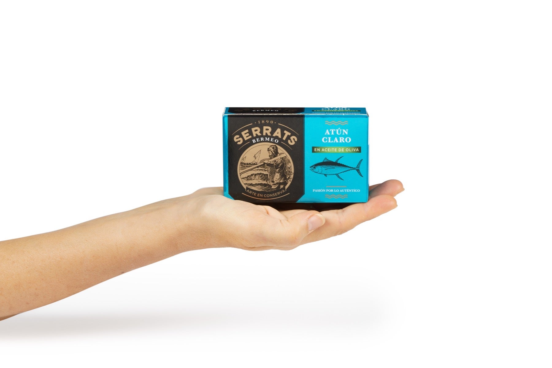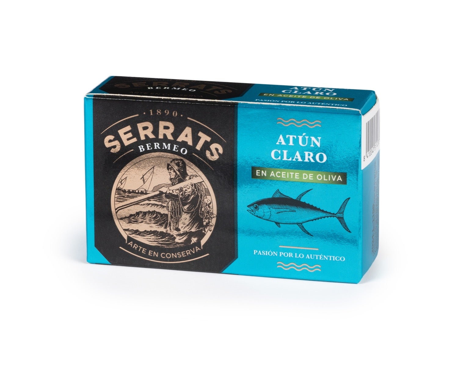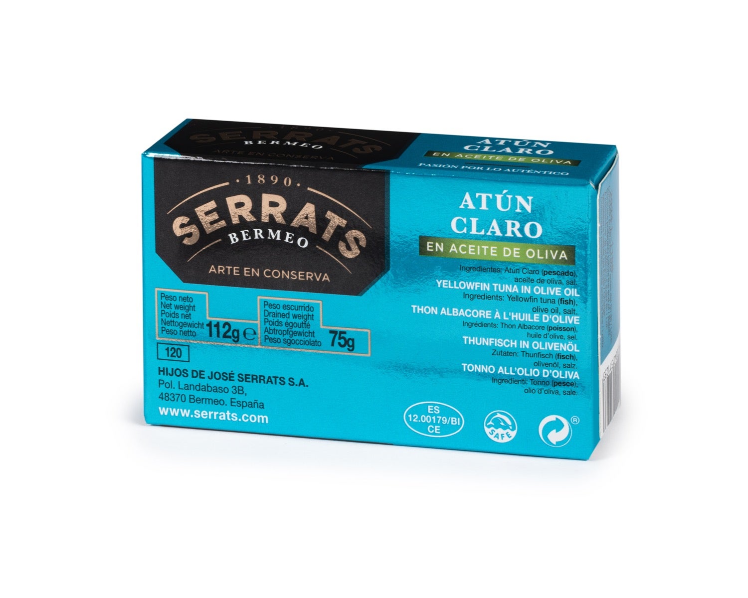 Lata de lomos de Atún Claro, cuidadosamente seleccionados por Conservas Serrats, cubiertos con aceite de oliva y presentados en envase metálico.