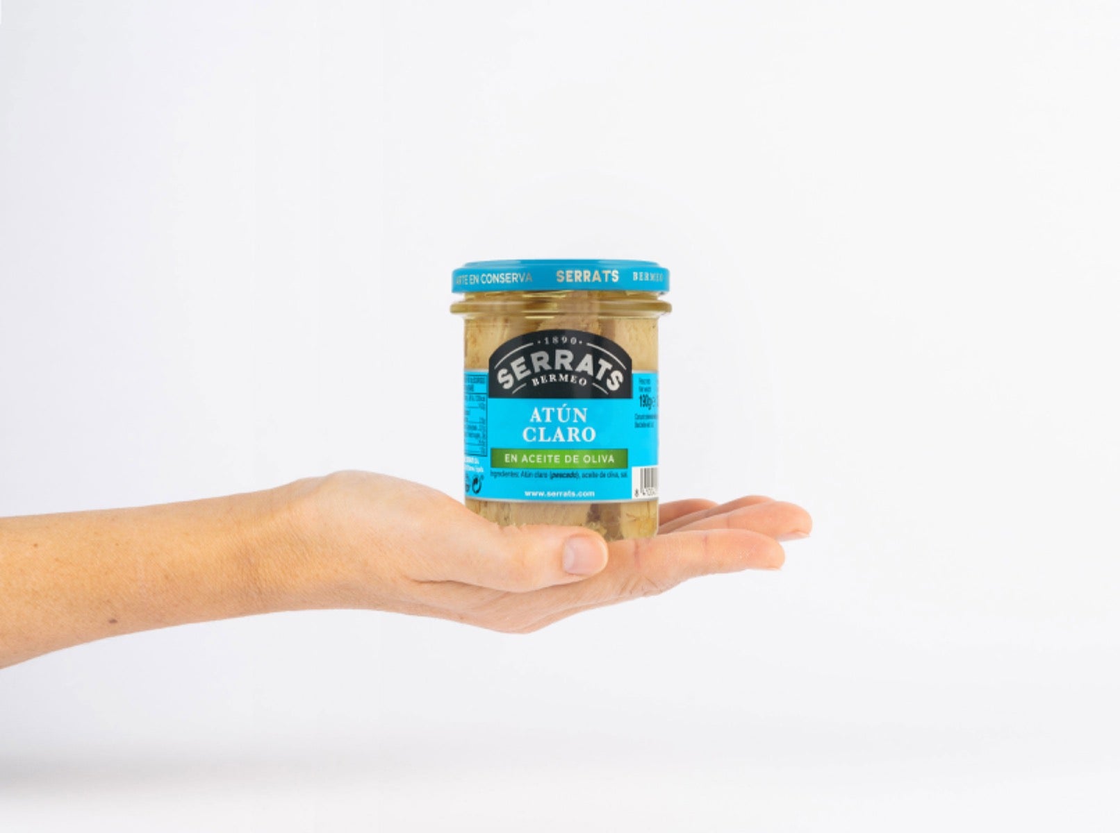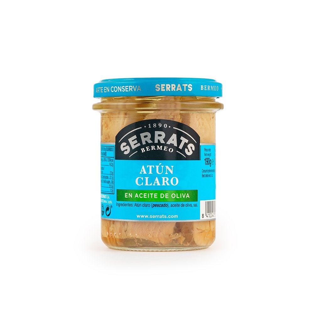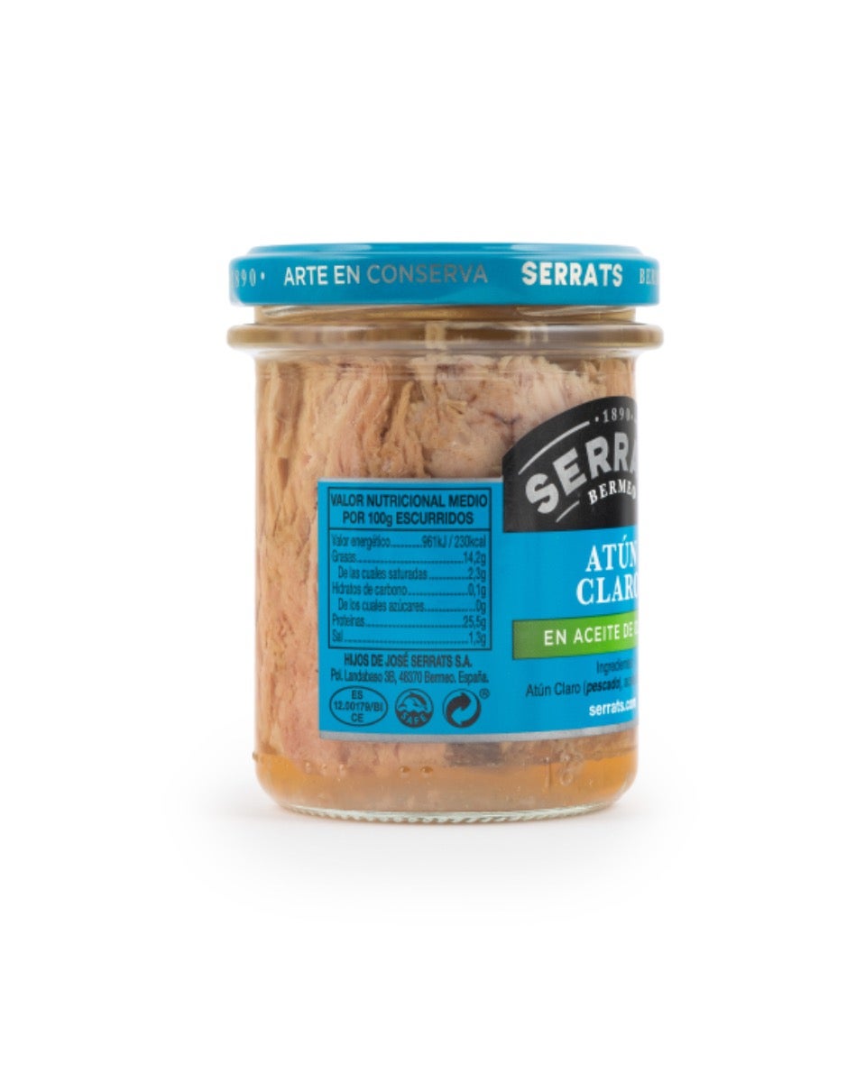 Lomos de Atún Claro, cuidadosamente seleccionados por Conservas Serrats, cubiertos con aceite de oliva y presentados en frasco de cristal.