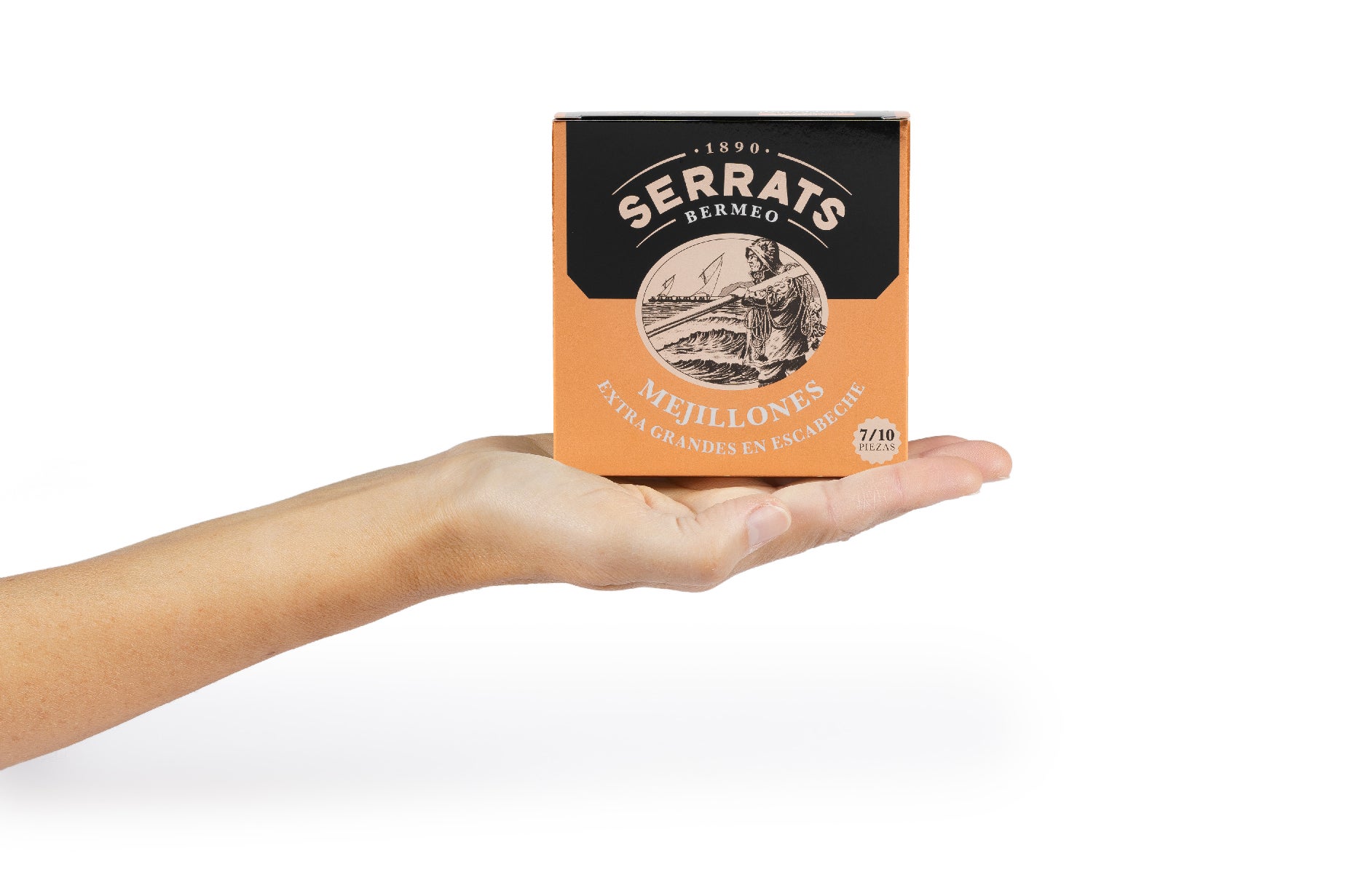 Las latas de mejillones en escabeche de Conservas Serrats constituyen una pieza de delicatessen con aroma de mar y el sabor del escabeche tradicional.