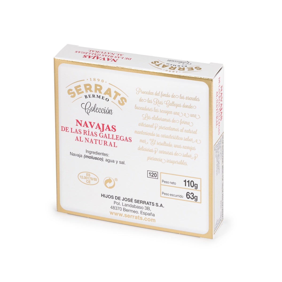 En Conservas Serrats seleccionamos las Navajas de máxima calidad procedentes de las Rías Gallegas. Perfectamente limpias, brillantes y sabrosas con una textura suave y jugosa. Las conservamos al natural y te las presentamos en envase metálico.