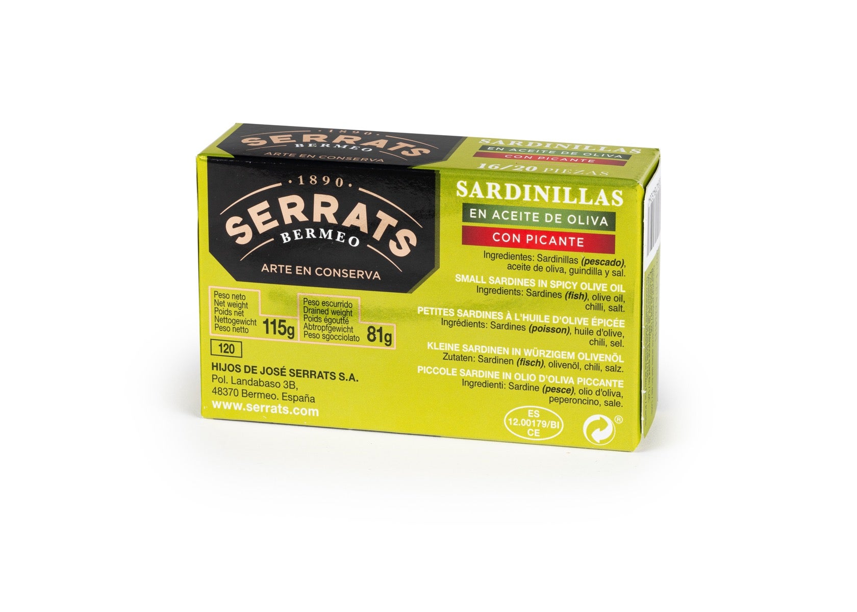 En Conservas Serrats, seleccionamos cuidadosamente las Sardinillas más pequeñas. Están tostadas al vapor y cubiertas en aceite de oliva con un toque de guindilla. Te las presentamos en envase metálico.
