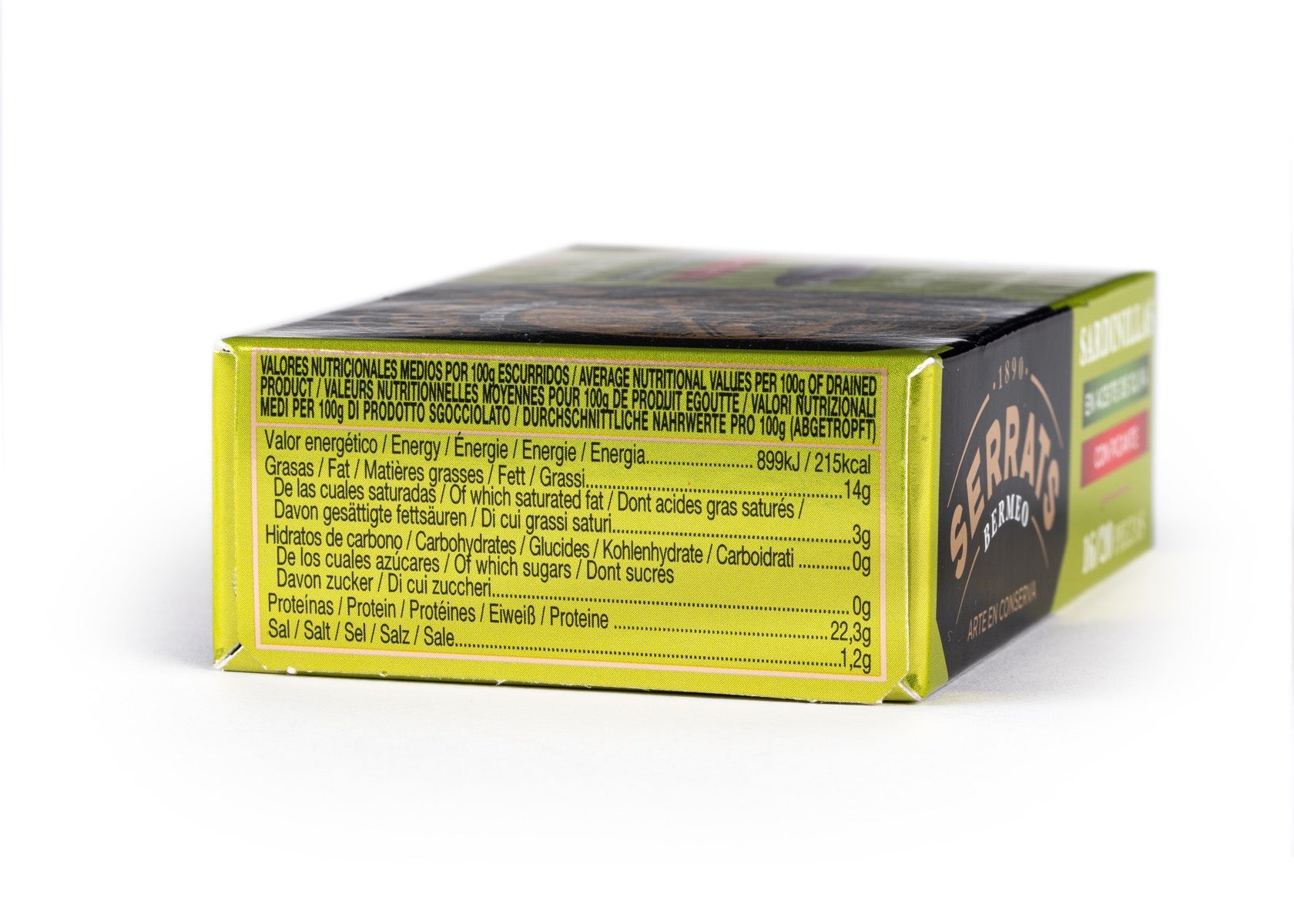 Estas sardinillas destacan por su atractivo aspecto plateado y su magnífica presentación: perfectamente limpias, brillantes y sabrosas, con una textura suave y jugosa. Para la elaboración de estas latas hemos elegido las sardinillas pequeñas, las más apreciadas. Aproximadamente en una lata podemos encontrar entre 16 a 20 piezas.