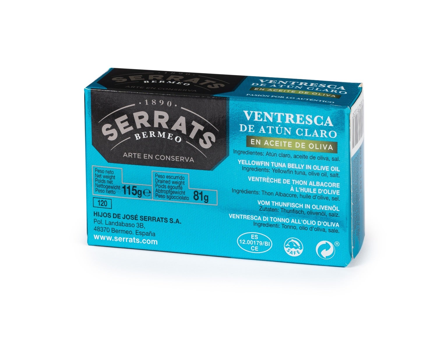 Filetes de Ventresca de Atún Claro, cuidadosamente seleccionados por Conservas Serrats, cubiertos con aceite de oliva y presentados en envase metálico.