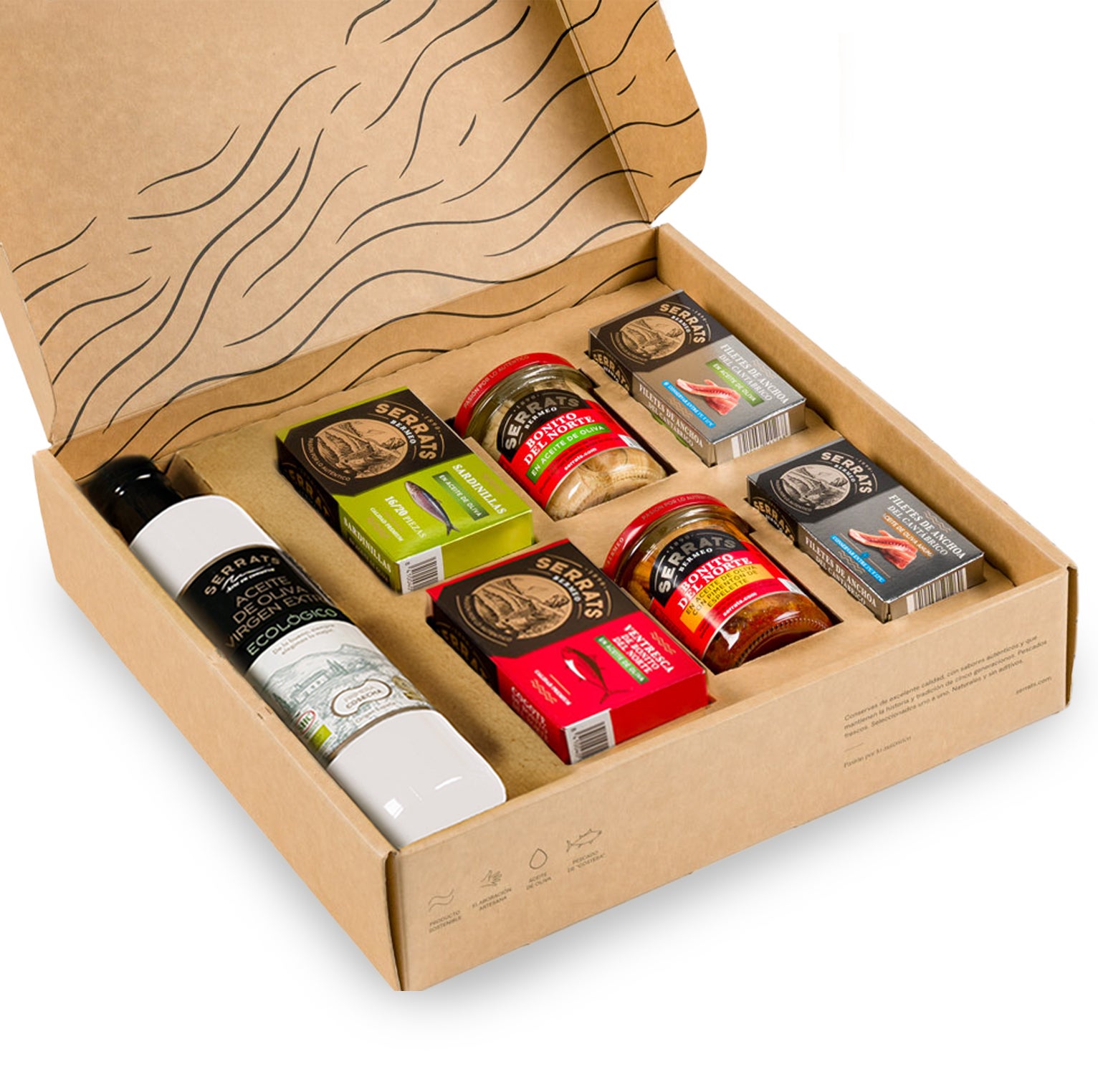 An exquisite gourmet selection featuring 7 premium products: Albacore Tuna loins in olive oil and with Espelette pepper, Albacore Tuna Belly in olive oil, Cantabrian Anchovies in olive oil and in smoked olive oil, small Sardines in olive oil. As a culmination, a 500ml bottle of organic extra virgin olive oil with an intense and delicious flavor.