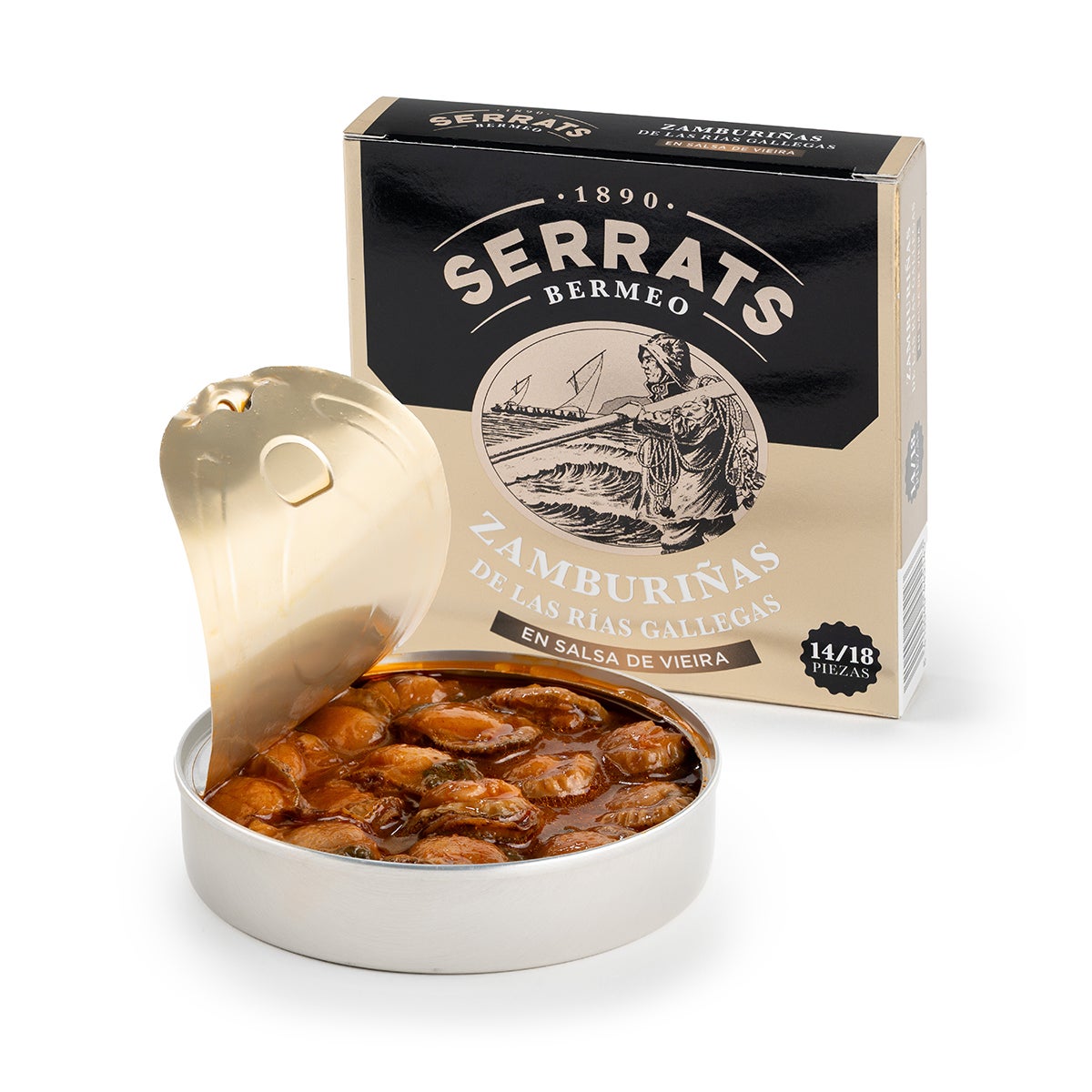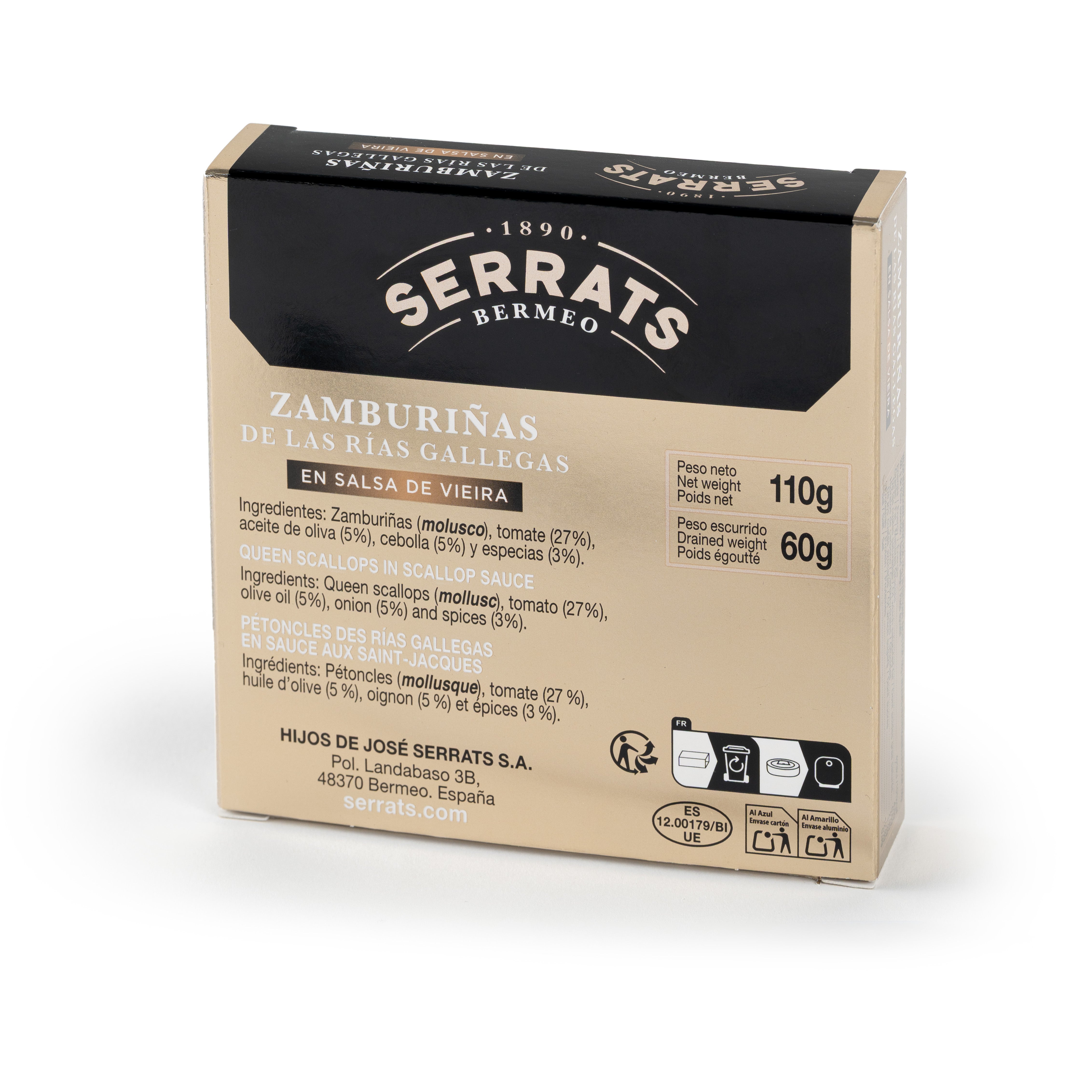 Queen Scallops from the Rías Gallegas (Galician estuaries) in a traditional scallop sauce are one of those preserves that speak for themselves. A delicate product, crafted using artisanal methods, that reflects the essence of the canning tradition of Conservas Serrats since 1890.