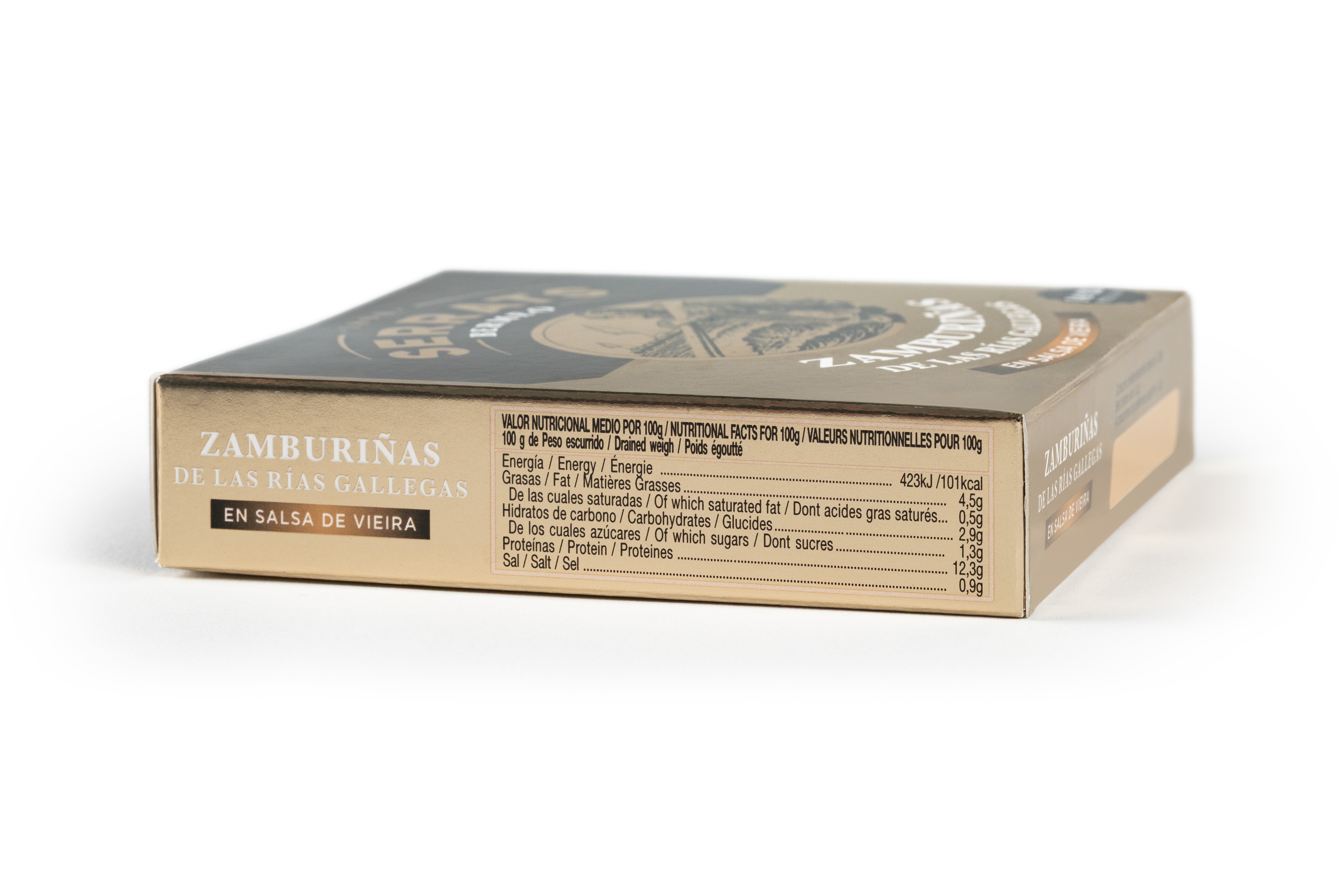 These Queen Scallops from the Rías Gallegas (Galician Estuaries) are a true seafood delicacy, crafted using traditional artisanal methods. They are served with traditional scallop sauce and presented in a metal tin.