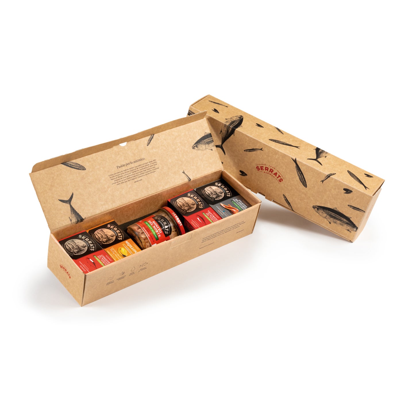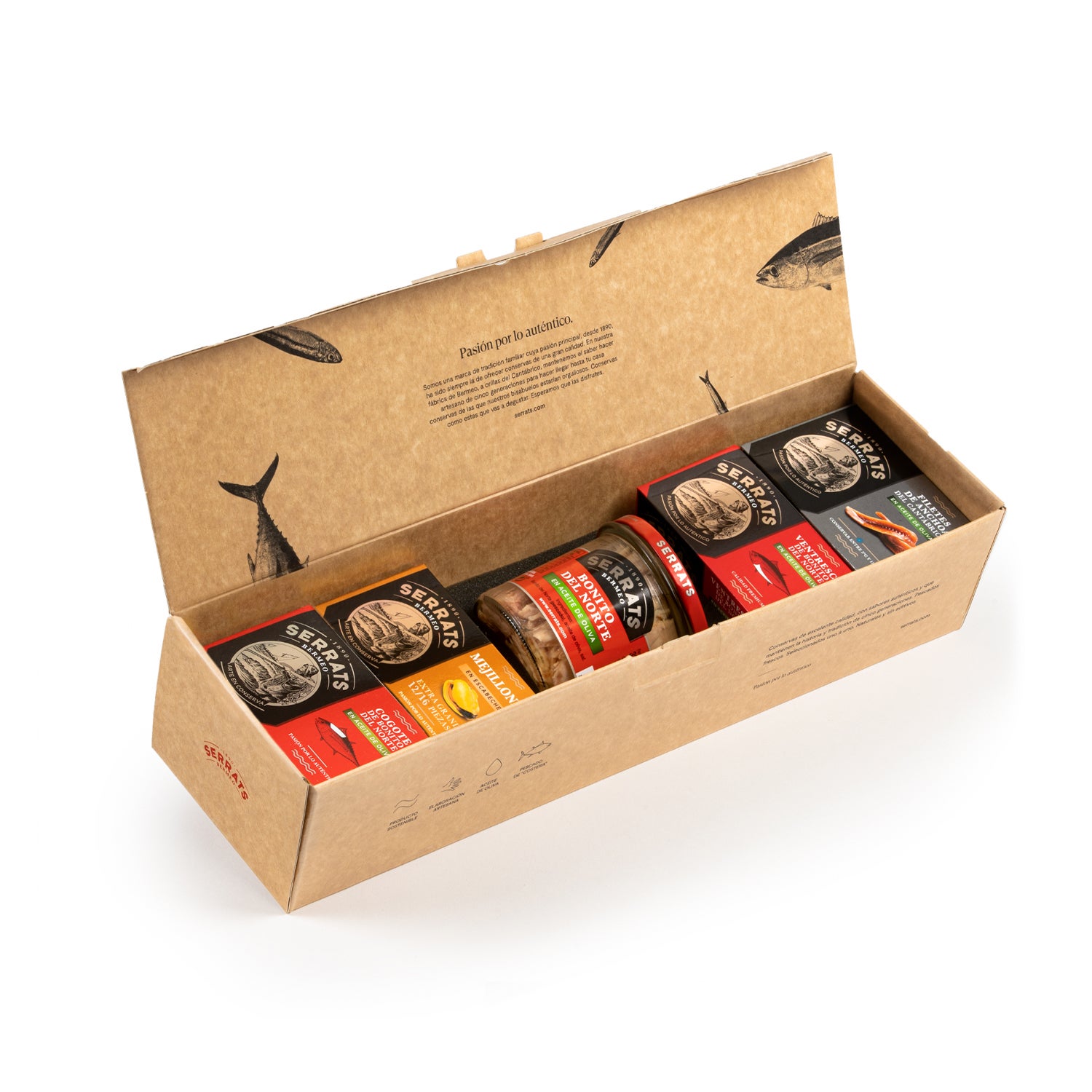 Assortiment exquis composé de 9 conserves : Thon Germon recouvert d’huile d’olive et mariné, Nuque et Ventrèche de Thon Germon recouverts d’huile d’olive soigneusement sélectionnée ; Anchois de la mer Cantabrique et deux de nos spécialités : Moules et petites Sardines.