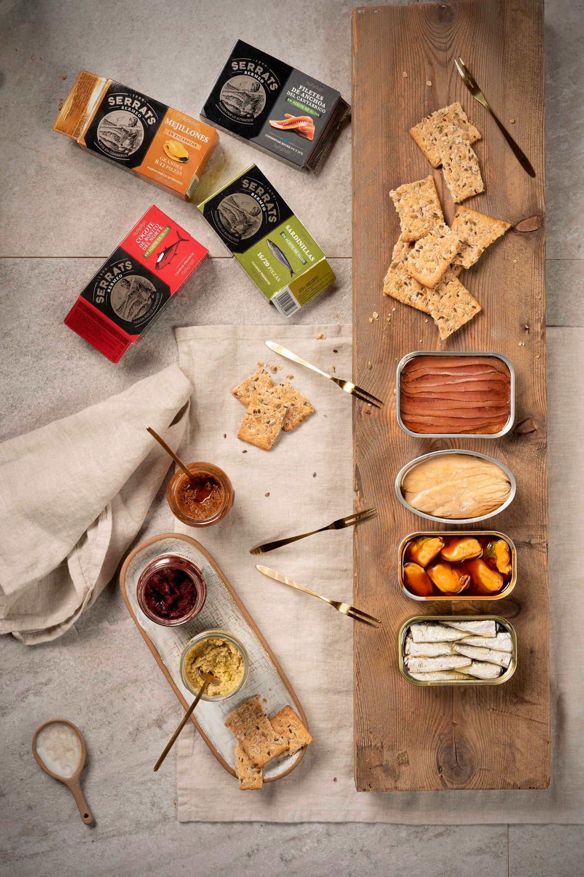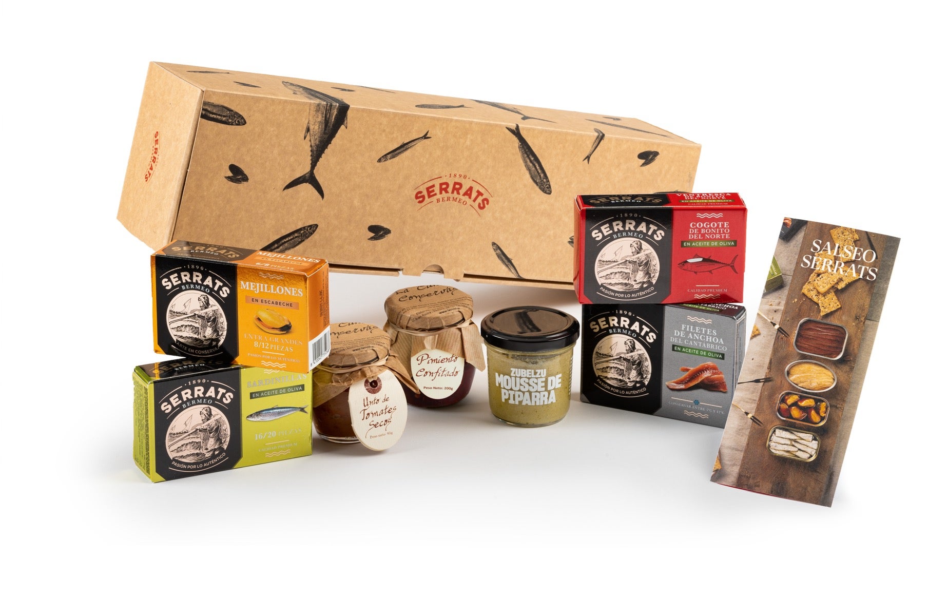 Dans ce coffret, nous avons rassemblé une sélection de nos meilleures conserves : cou de thon de la côte, anchois printaniers de Cantabrie, sardines « txikis » à l'huile d'olive et grosses moules accompagnées de trois sauces super originales : tomates séchées, mousse de piment « piparra » et une sauce aux poivrons confits.