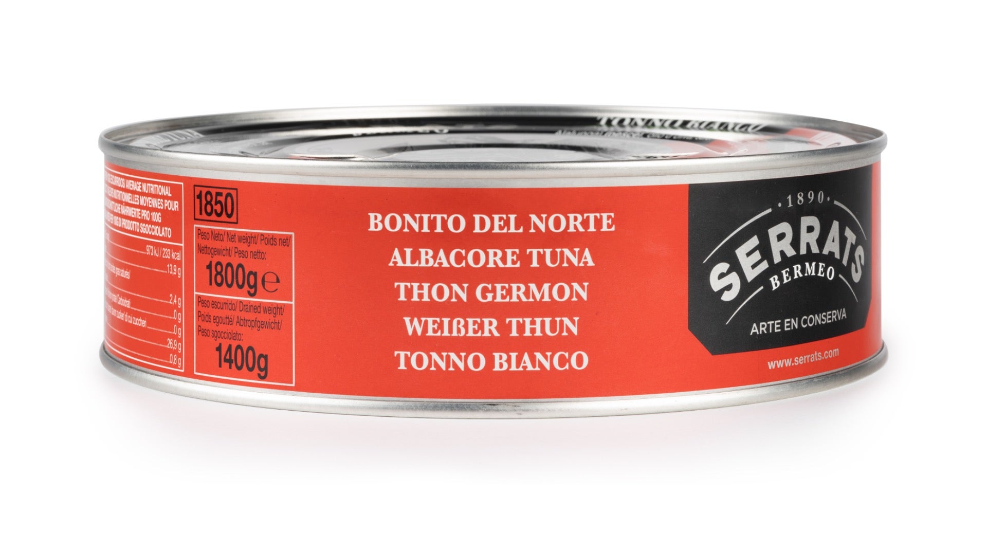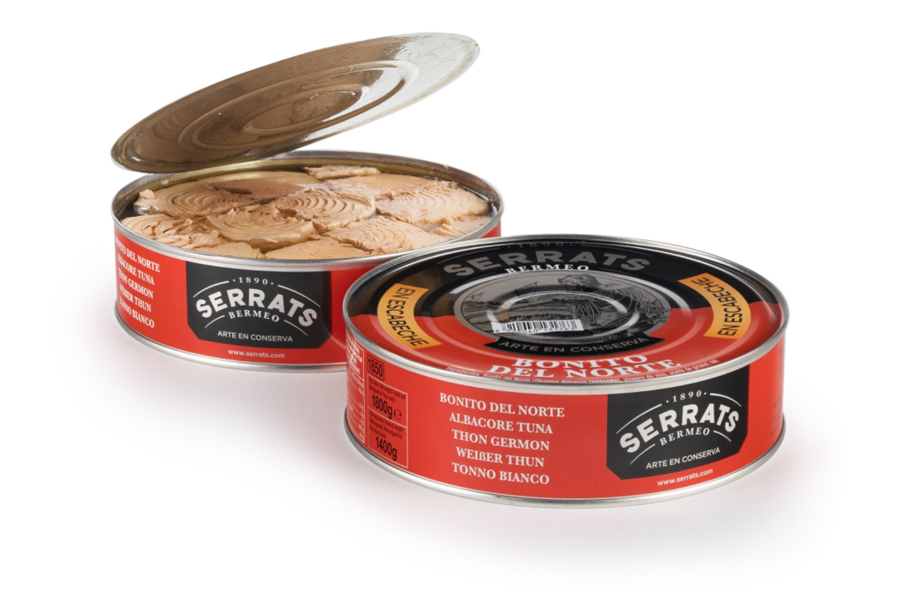 Échines de Thon Germon, sélectionnés avec soin pour les Conserves Serrats, recouvert de sa sauce en marinade et présenté dans un conditionnement métallique.