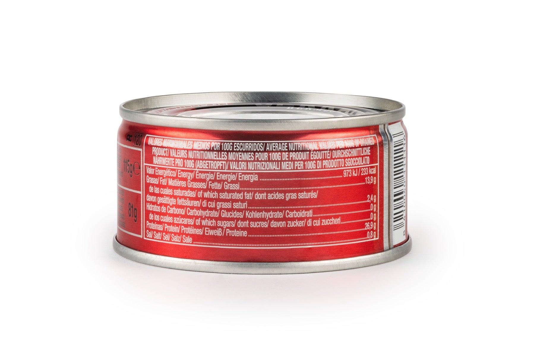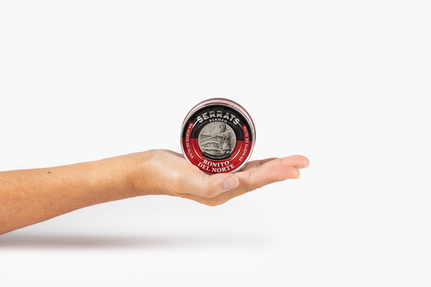 Échines de Thon Germon, soigneusement sélectionnés pour les Conserves Serrats, baignés dans de l’huile d’olives et présentées dans un emballage métallique, avec la taille la plus "typique" des conserves.