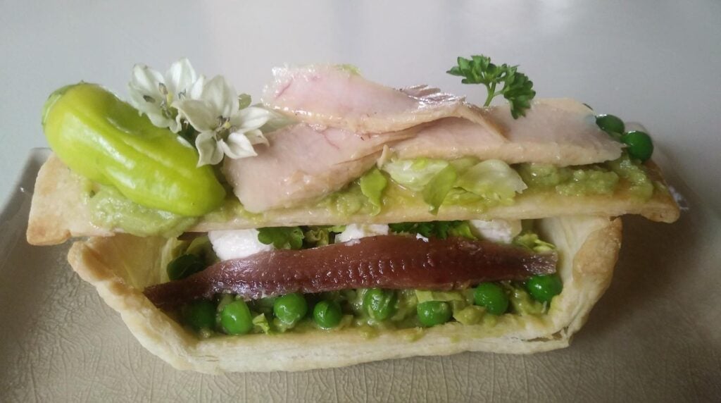 Canapé de hojaldre para Navidad. Con verduritas, anchoas del Cantábrico y ventresca de Bonito del Norte