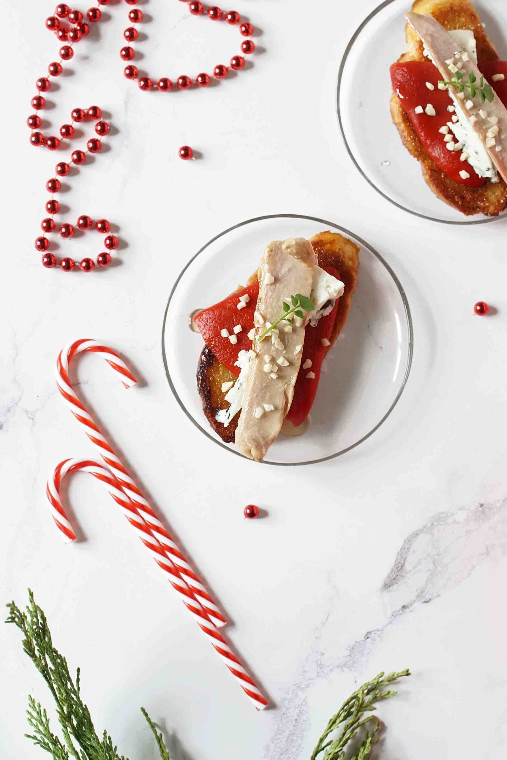 Canapés de pimientos, queso y ventresca sobre tostas caramelizadas a la miel